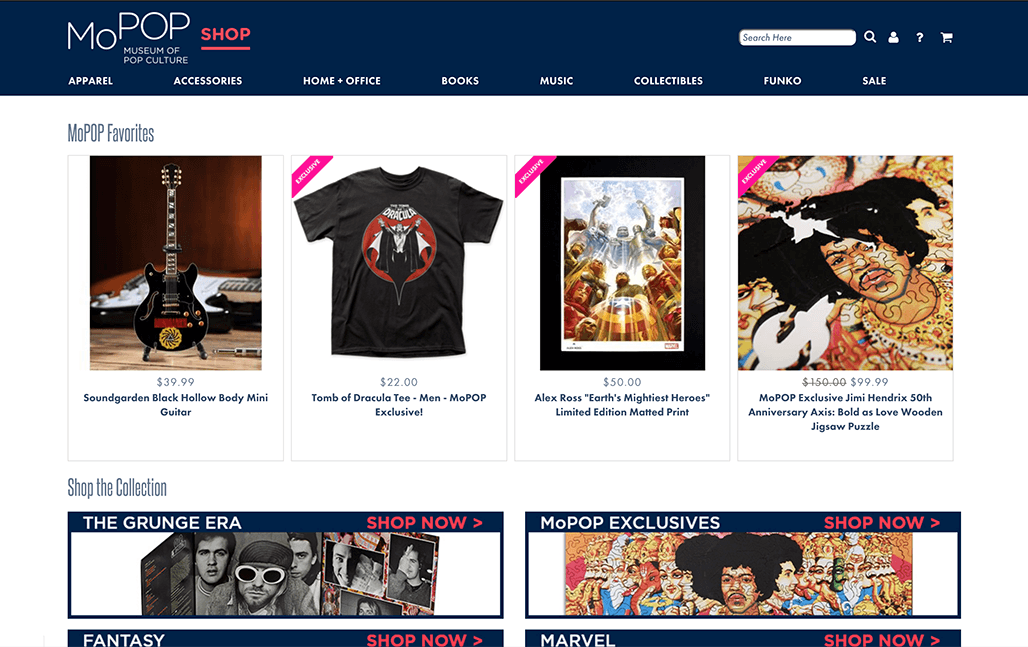 MoPOP (Museum of Pop Culture) is a Seattle based museum. They have a gift shop in the front where they offer an assortment of pop culture items such as apparel, toys, vinyl, etc. Their online shop has most of the same items, including a few not seen in the shop. I was tasked with redesigning the shop.MoPOP.com for a certain persona, especially focusing on the site navigation (information architecture) and UI Design. My deliverables would be an updated IA and a redesign of the IxD in form of a clickable prototype. 2 Week Concept Project