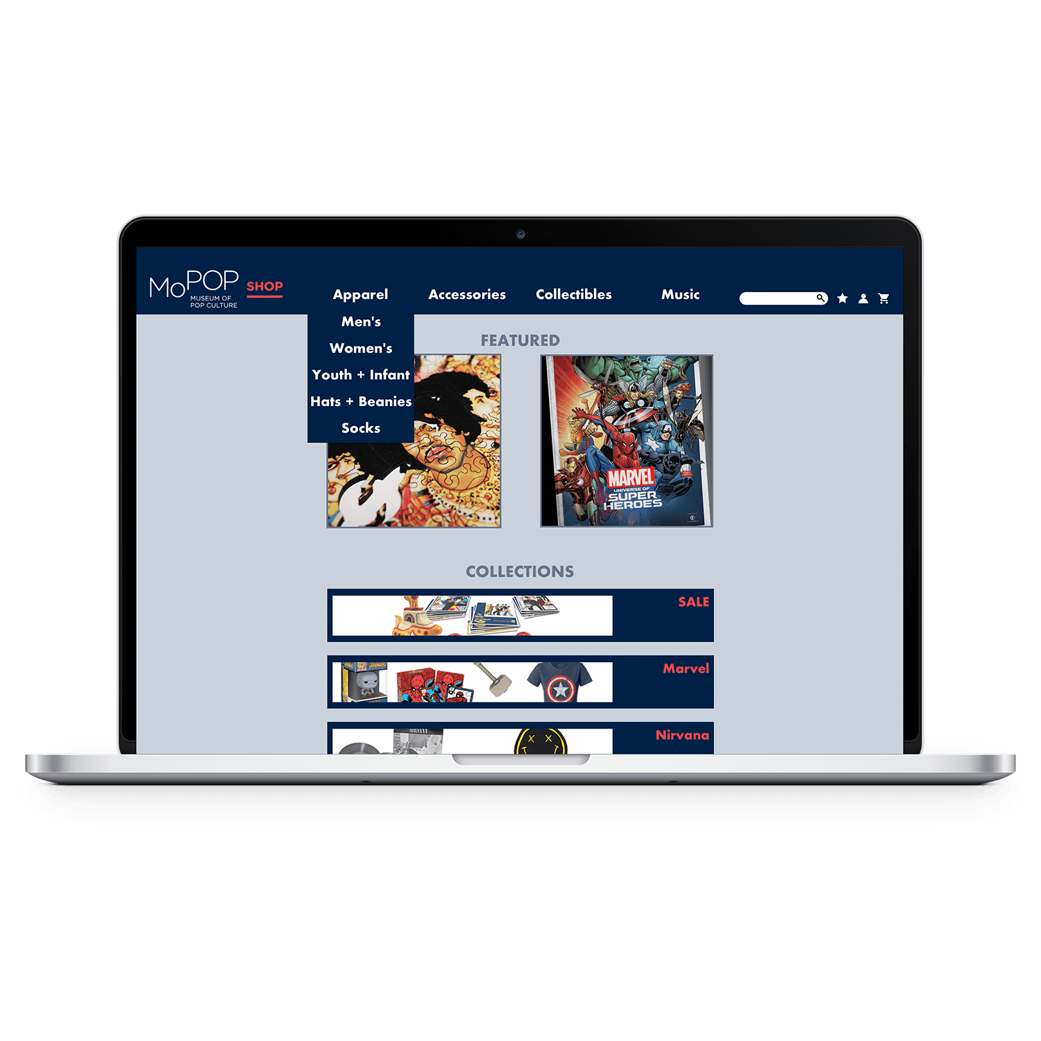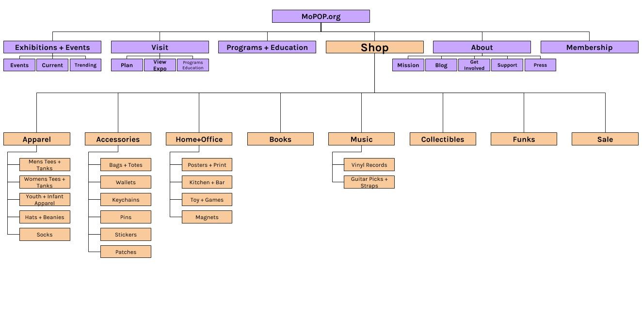 The current shop.mopop.com website has too many categories, leading to confusing site navigation, and has too many filter options, making finding the correct item difficult. I believe that by better sorting categories and removing unnecessary steps for the planful buyer we will achieve a less complex and easier site to navigate.
