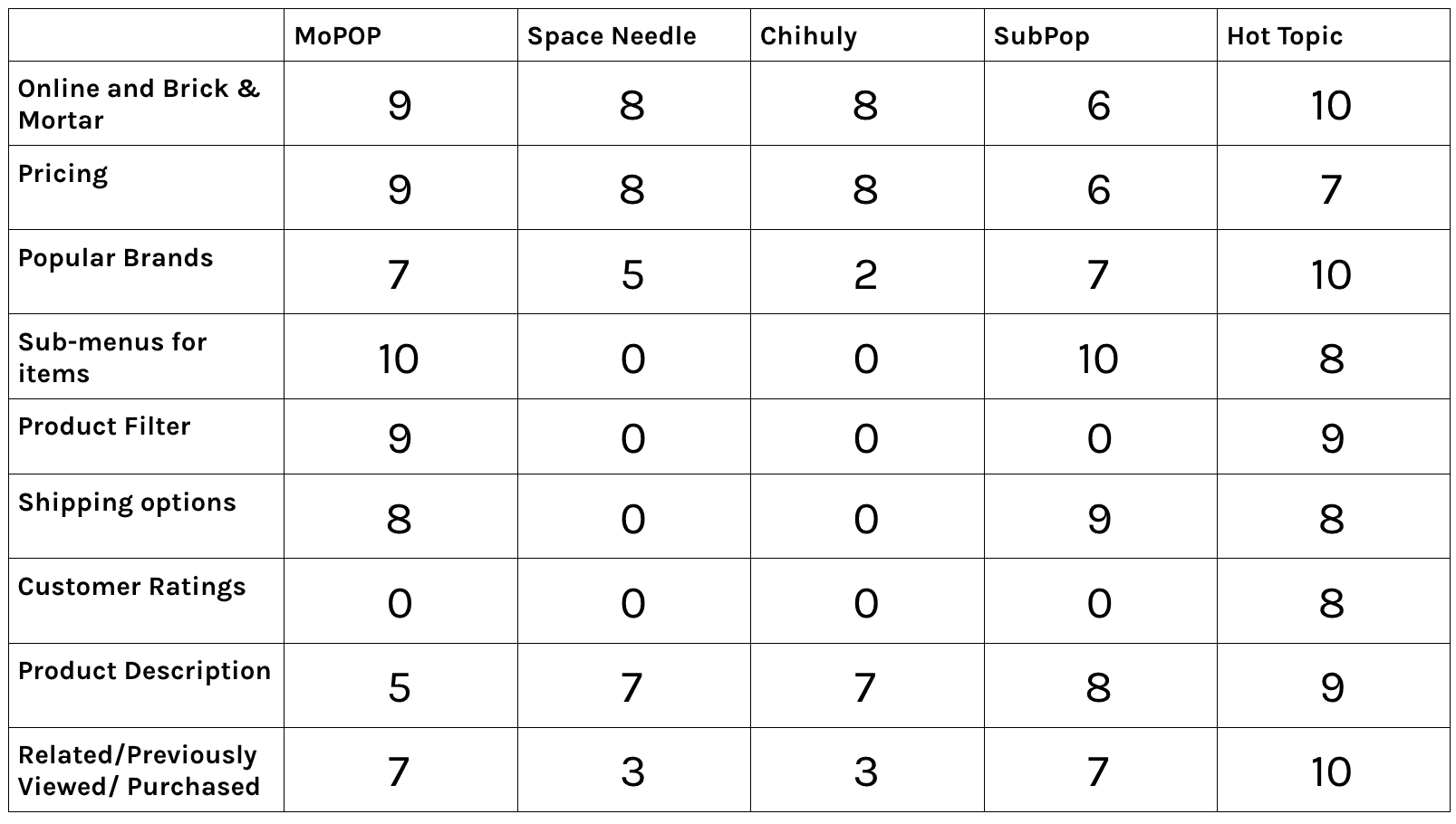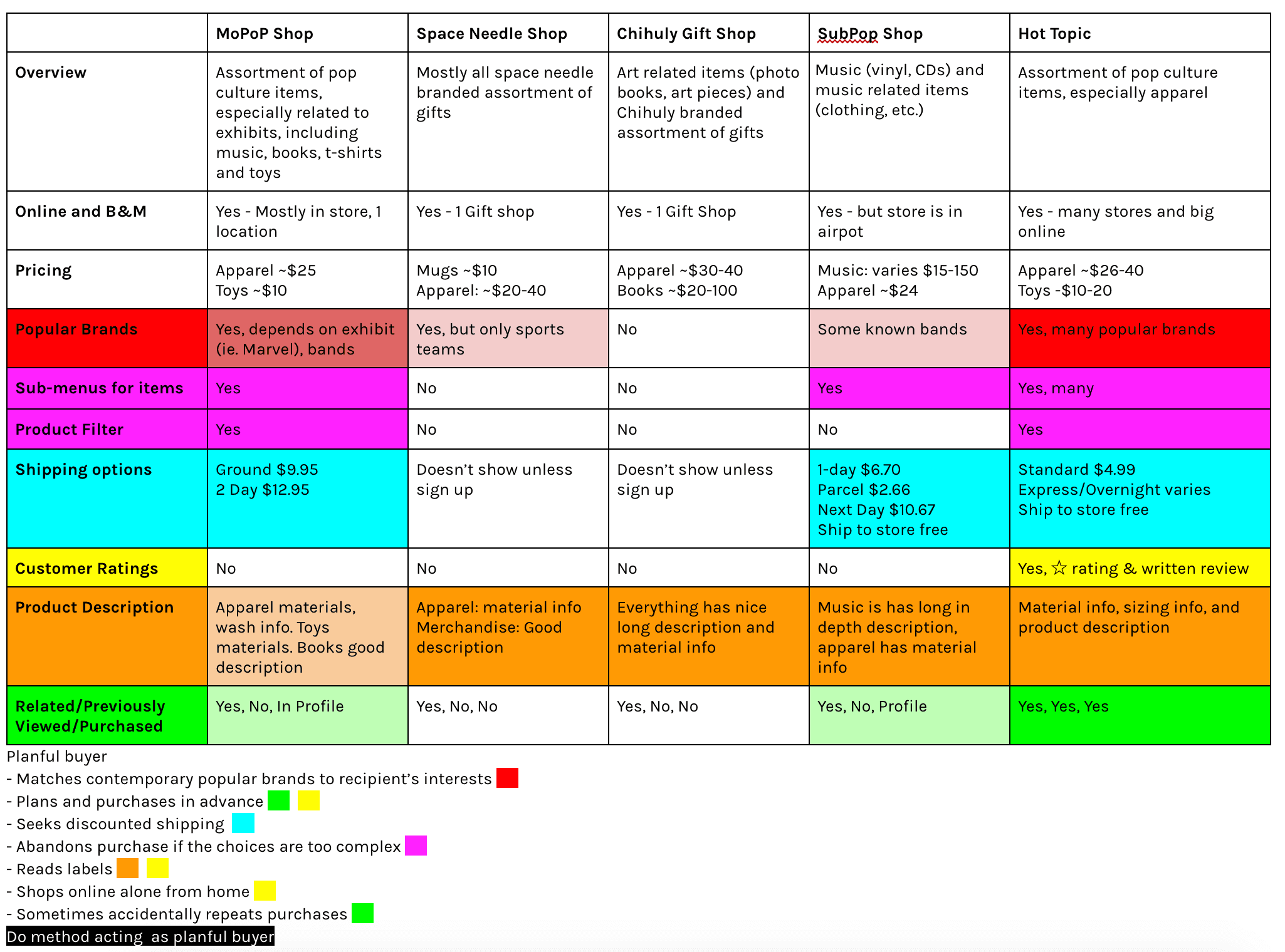 Competitive Research was a main point of research. Looking at what was successful for similar businesses was a great way to figure out what features would be useful in the redesign. I looked at 4 different online stores. The Space Needle Gift Shop and Chihuly Gift Shop were chosen for proximity similarity, SubPop Shop and Hot Topic were chosen for similar items sold. I made a list of features employed by all the sites, and ranked how well these features were implemented on the sites.