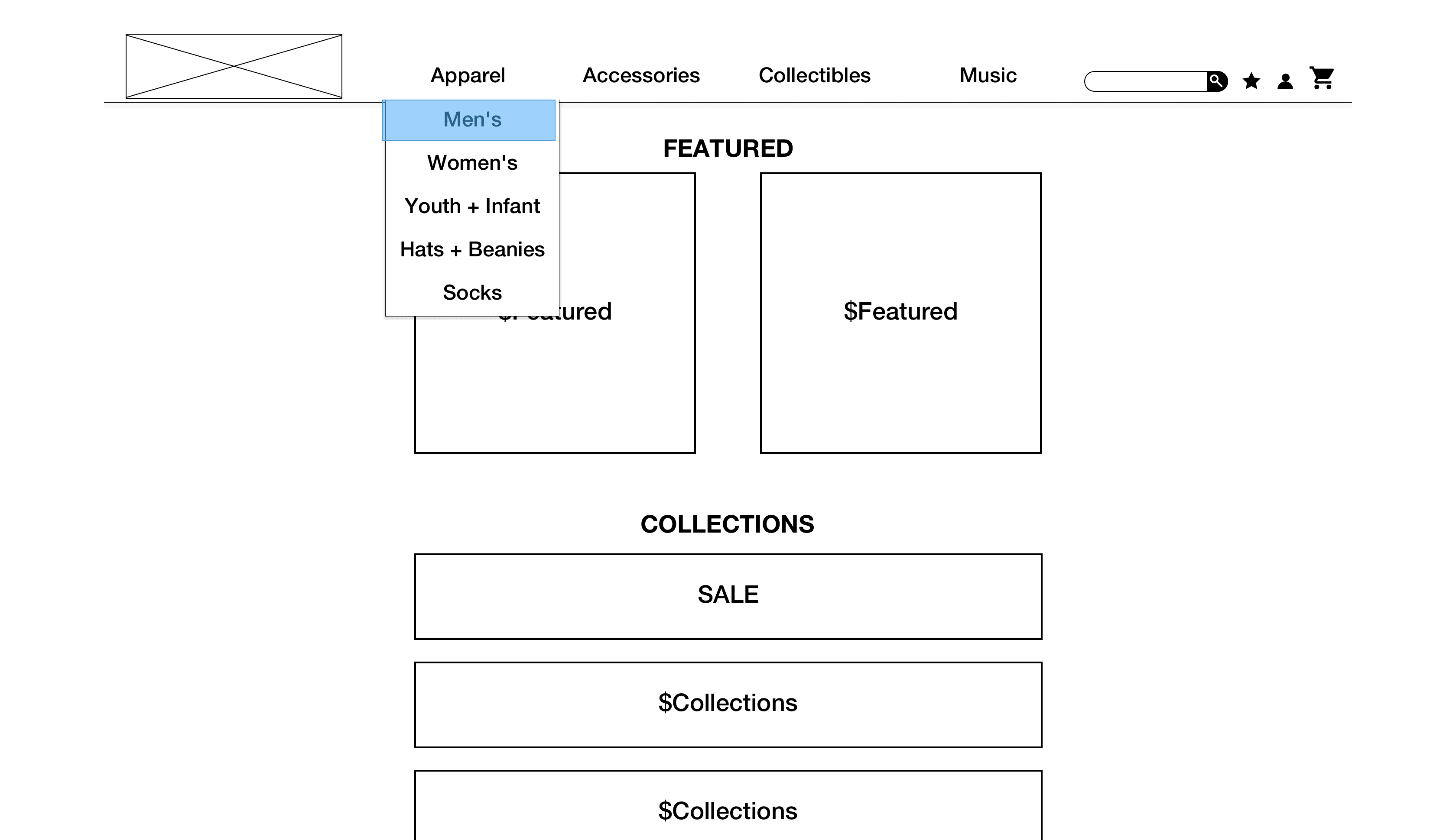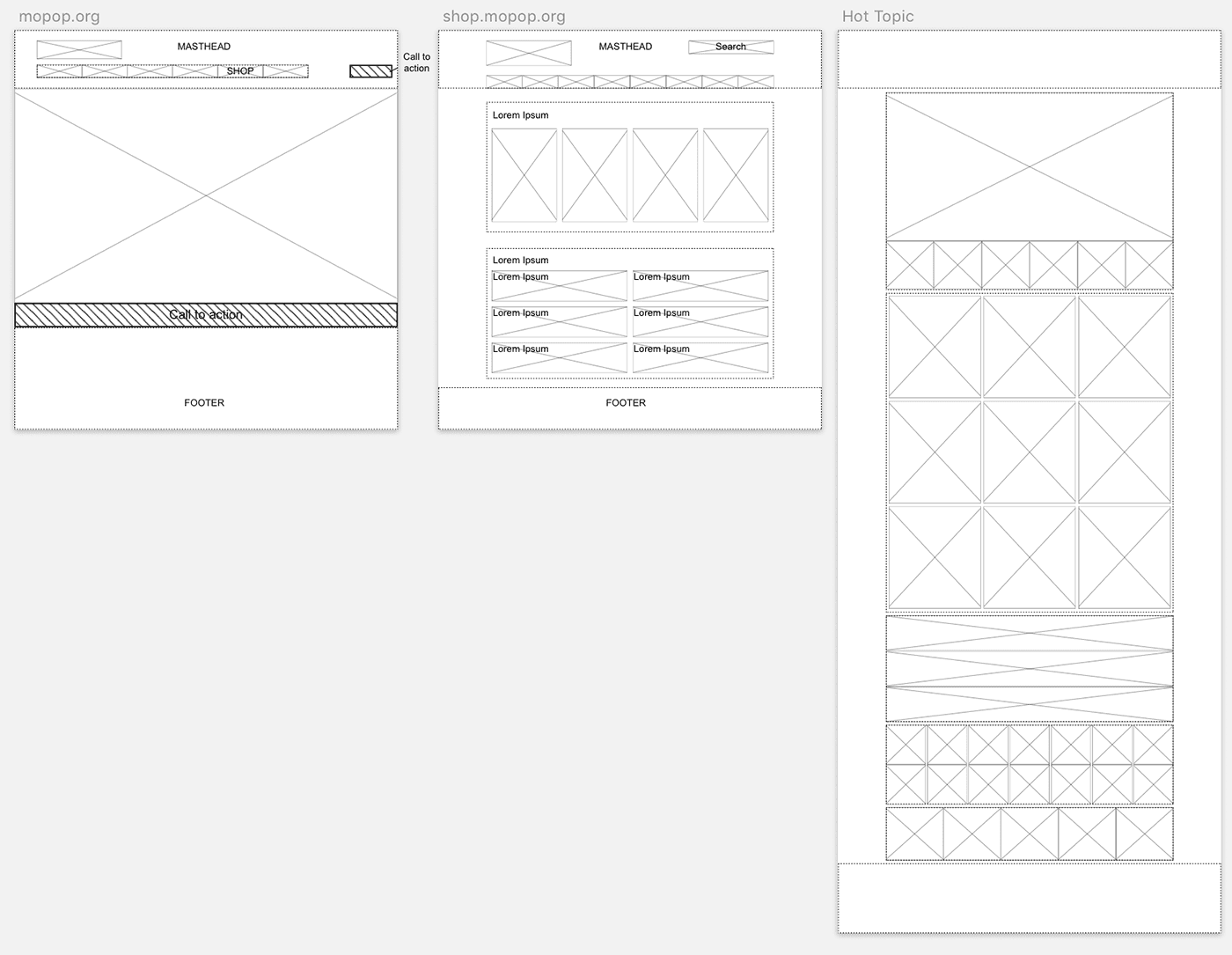 To start, I blocked out some current pages of the website. Along with MoPOPs, I also blocked out Hot Topic’s main page. Through competitive analysis, Hot Topic had the most features that made for a successful experience. From this, I had had a good idea of how I wanted to start laying out pages.