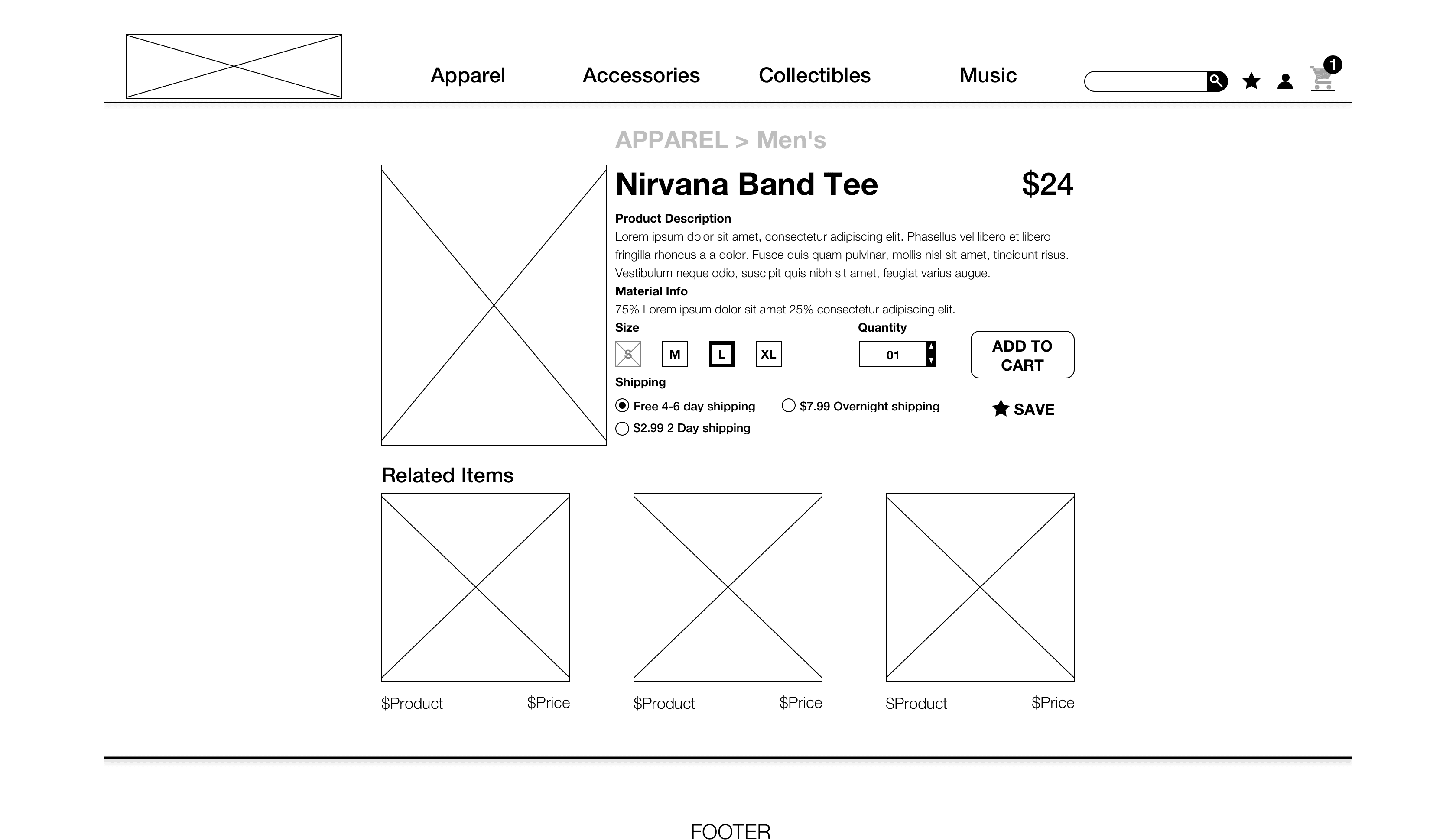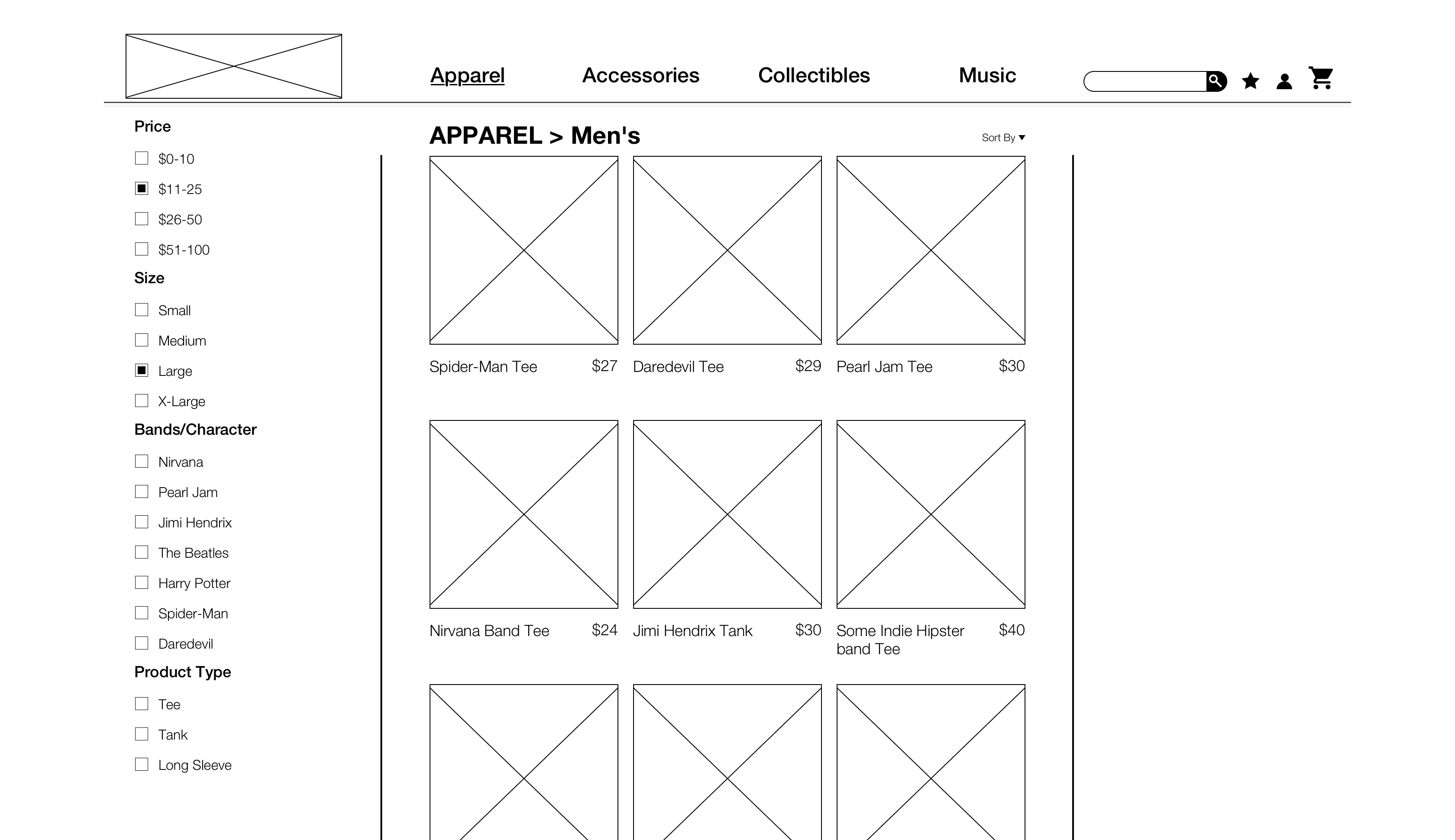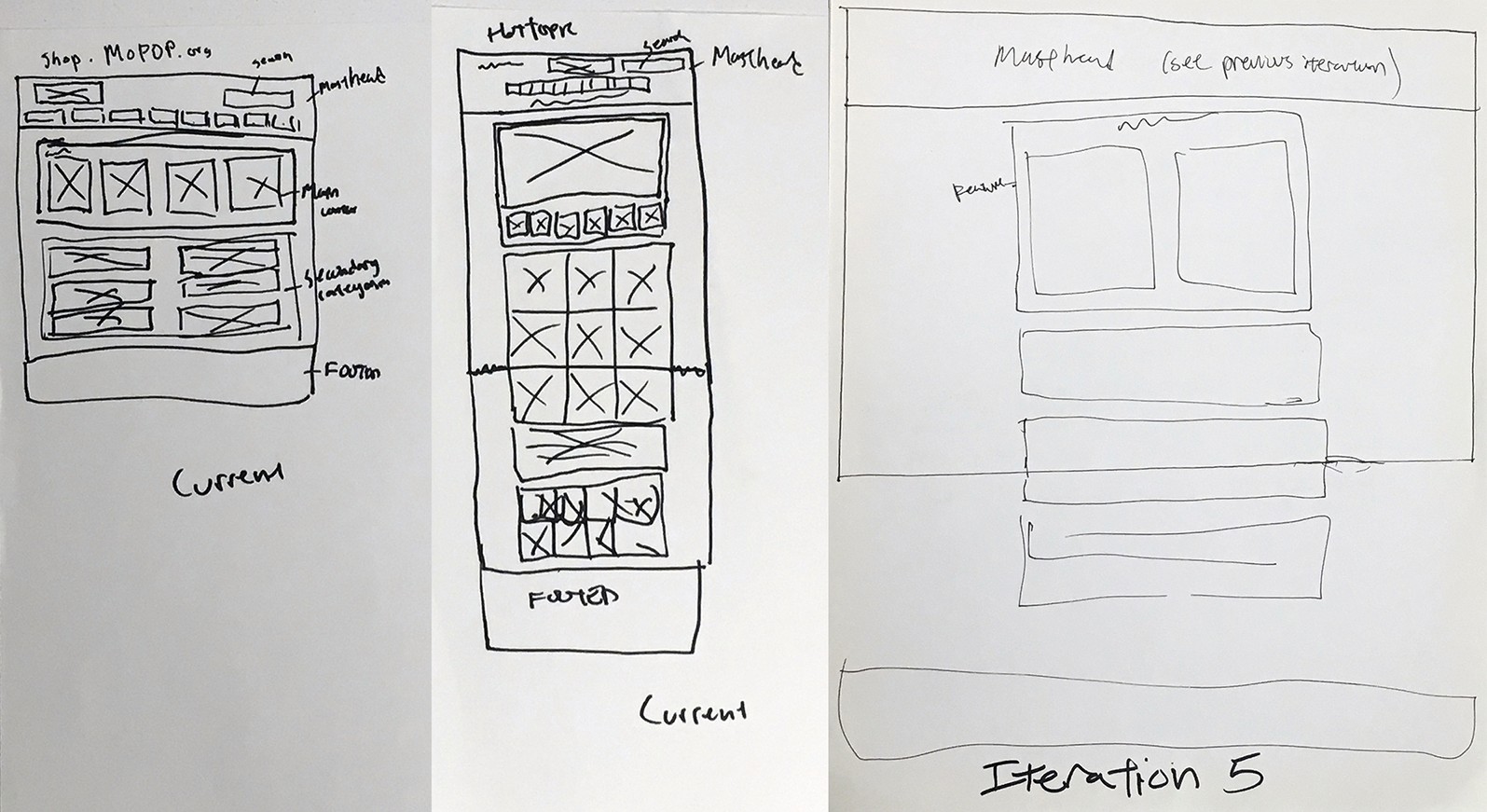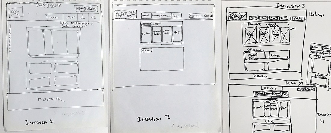 Keeping my User Tasks in mind, and the insights from blocking out the current site and Hot Topic’s site, I started sketching out some pages. Keeping my persona in mind, I made a few iterations before going to digital so I could start user tests on clickable prototypes of wireframes.